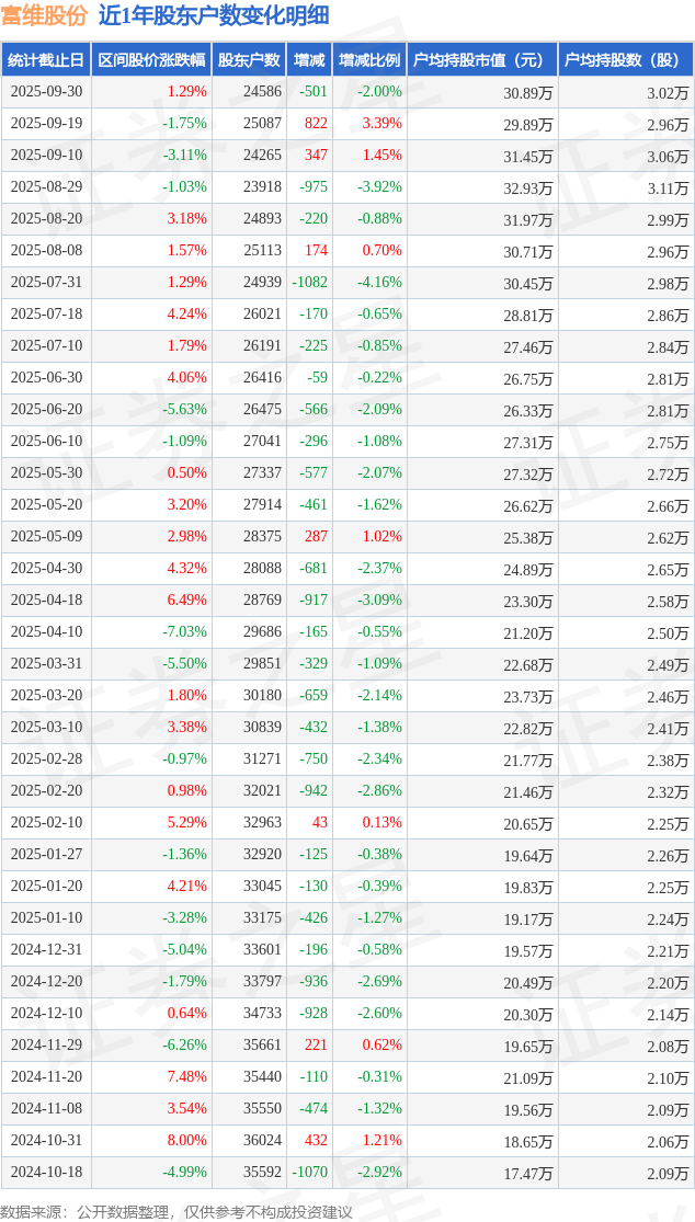 从股价来看,2025年9月19日至2025年9月30日,富维股份区间涨幅为1.29%,在此期间股东户数减少501.0户,减幅为2.0%。
