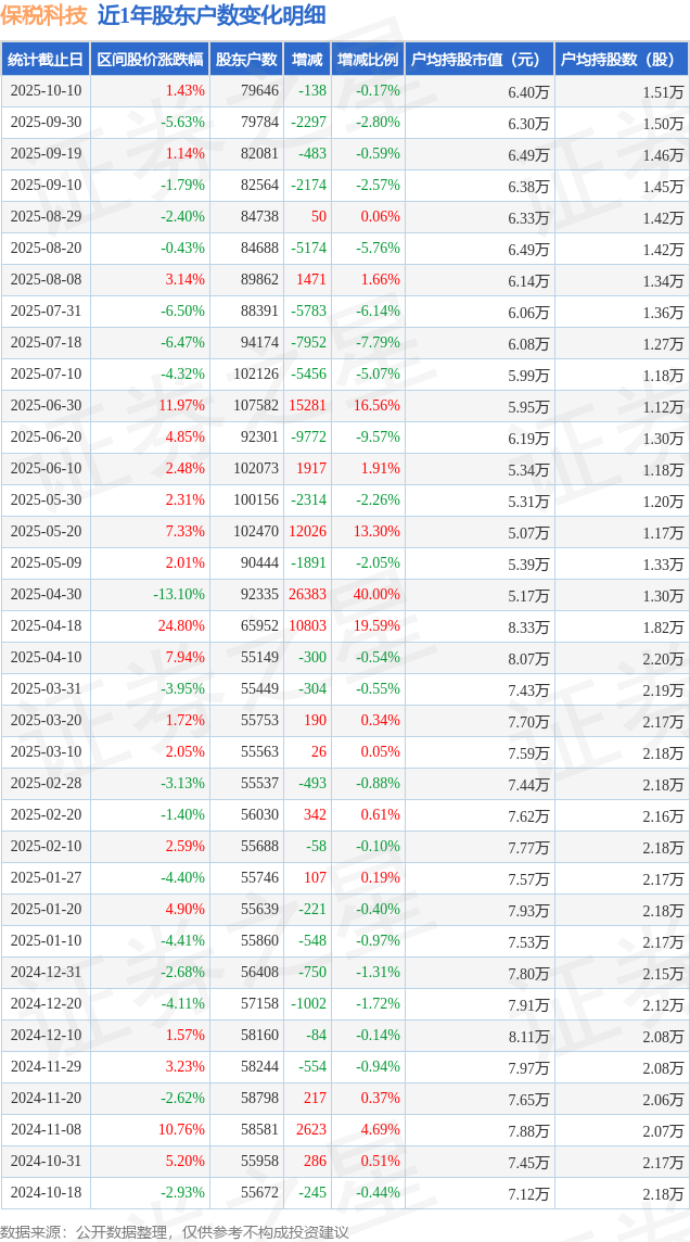 从股价来看,2025年9月30日至2025年10月10日,保税科技区间涨幅为1.43%,在此期间股东户数减少138.0户,减幅为0.17%。