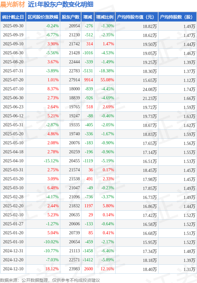 从股价来看,2025年9月20日至2025年9月30日,晨光新材区间跌幅为0.24%,在此期间股东户数减少276.0户,减幅为1.3%。