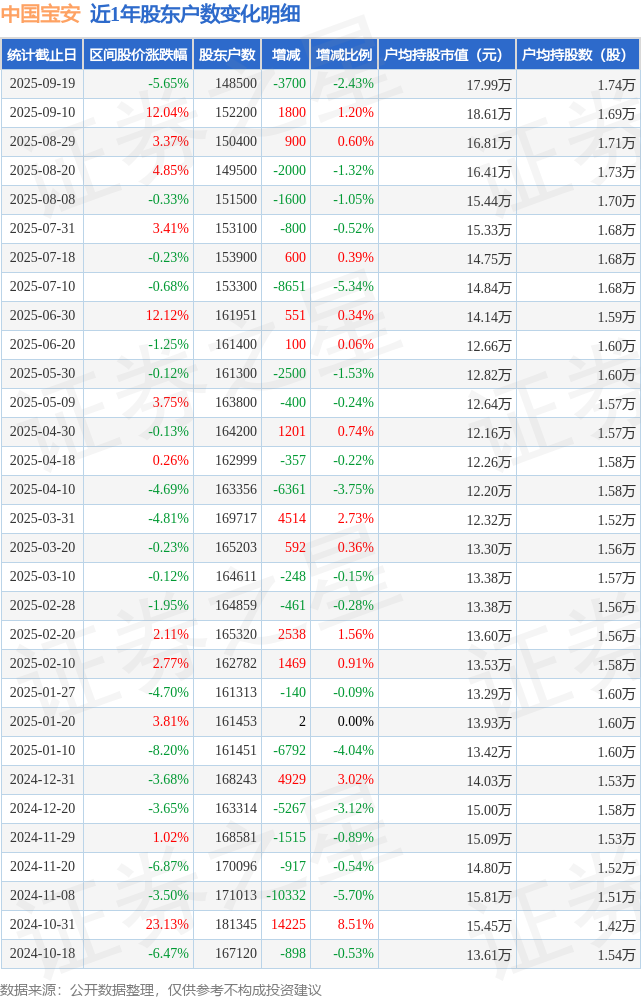 从股价来看,2025年9月10日至2025年9月19日,中国宝安区间跌幅为5.65%,在此期间股东户数减少3700.0户,减幅为2.43%。