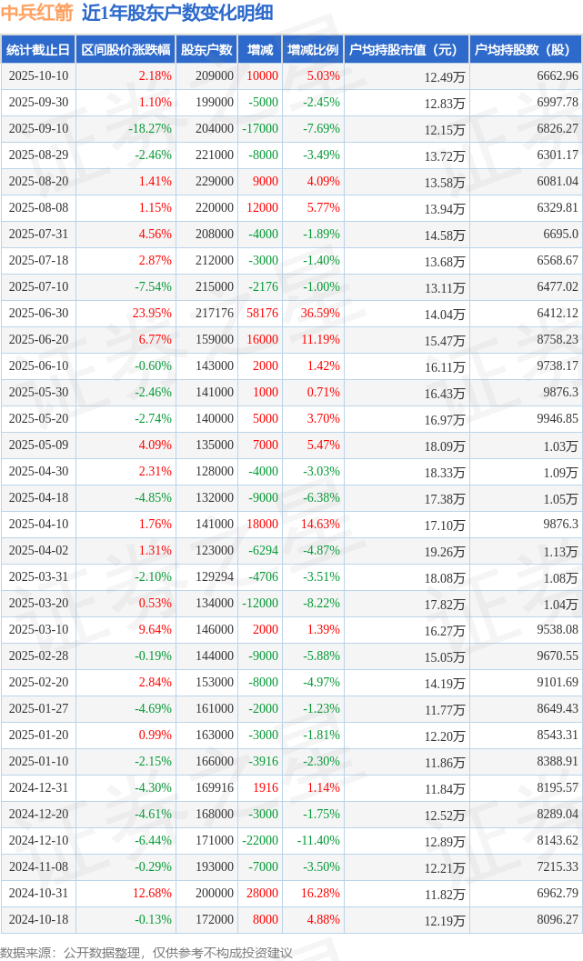 从股价来看,2025年9月30日至2025年10月10日,中兵红箭区间涨幅为2.18%,在此期间股东户数增加1.0万户,增幅为5.03%。