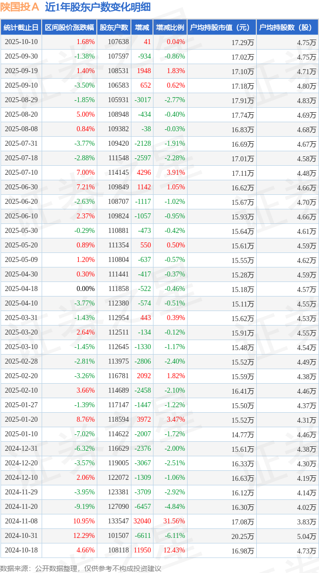 从股价来看,2025年9月30日至2025年10月10日,陕国投A区间涨幅为1.68%,在此期间股东户数增加41.0户,增幅为0.04%。
