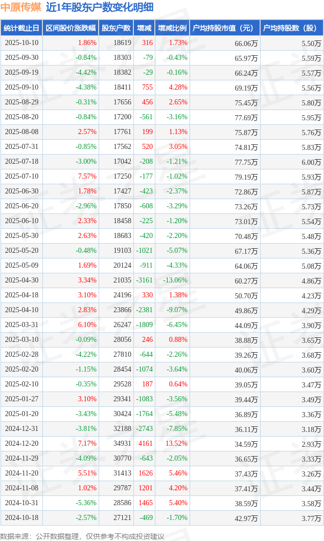 从股价来看,2025年9月30日至2025年10月10日,中原传媒区间涨幅为1.86%,在此期间股东户数增加316.0户,增幅为1.73%。