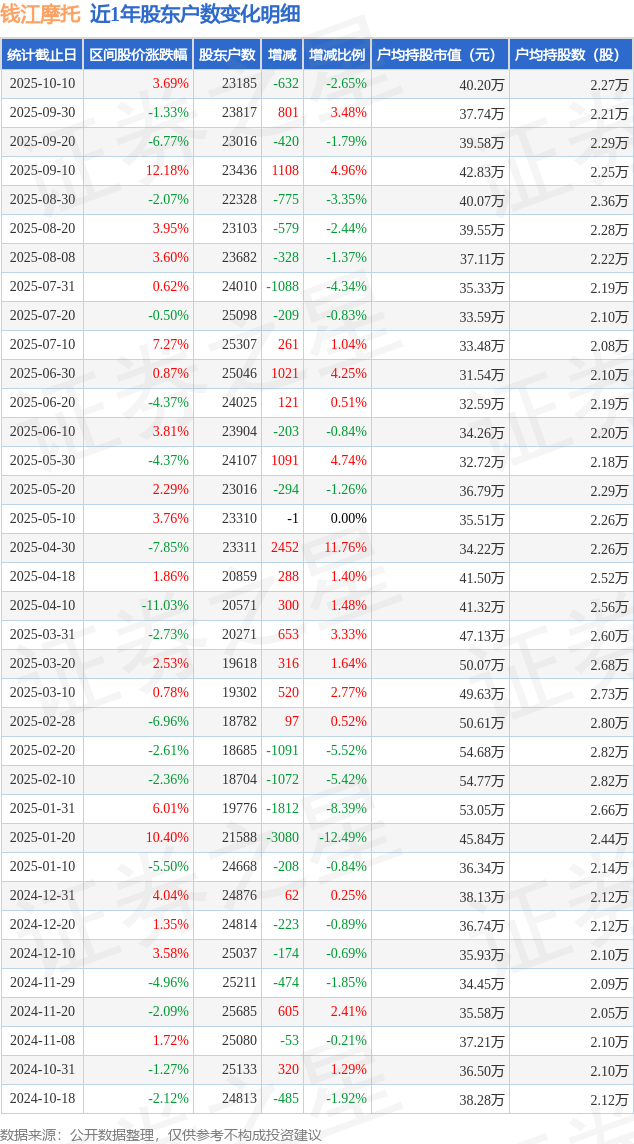 从股价来看,2025年9月30日至2025年10月10日,钱江摩托区间涨幅为3.69%,在此期间股东户数减少632.0户,减幅为2.65%。