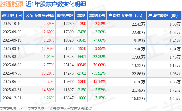 从股价来看,2025年9月30日至2025年10月10日,胜通能源区间涨幅为2.39%,在此期间股东户数增加390.0户,增幅为2.24%。