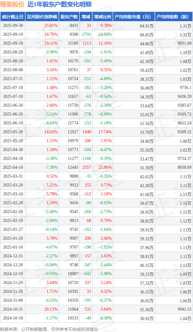从股价来看,2025年9月19日至2025年9月30日,锡装股份区间涨幅为23.81%,在此期间股东户数增加33.0户,增幅为0.39%。