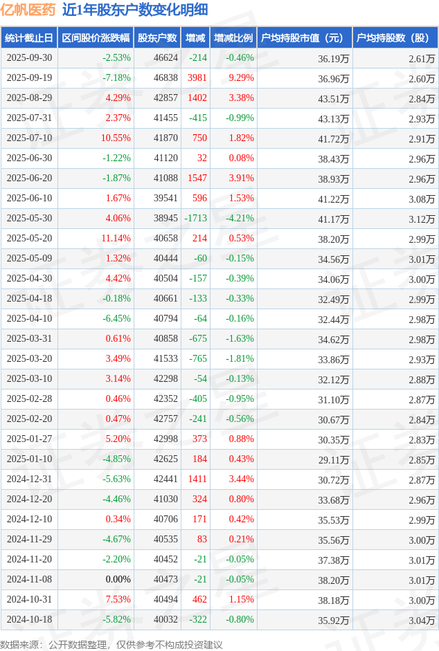 从股价来看,2025年9月19日至2025年9月30日,亿帆医药区间跌幅为2.53%,在此期间股东户数减少214.0户,减幅为0.46%。