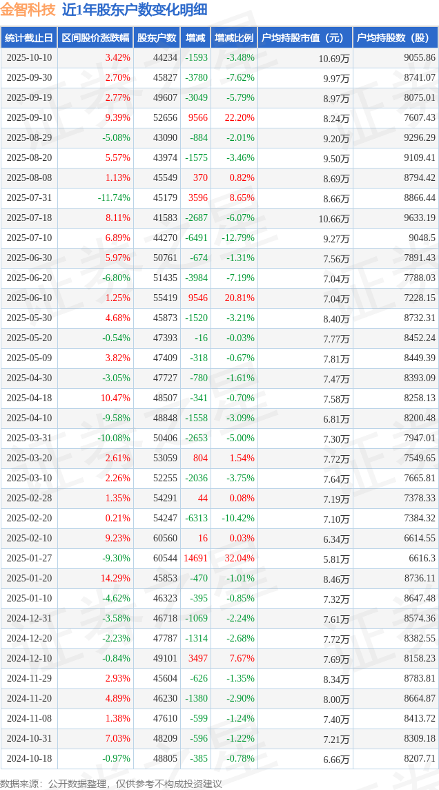 从股价来看,2025年9月30日至2025年10月10日,金智科技区间涨幅为3.42%,在此期间股东户数减少1593.0户,减幅为3.48%。