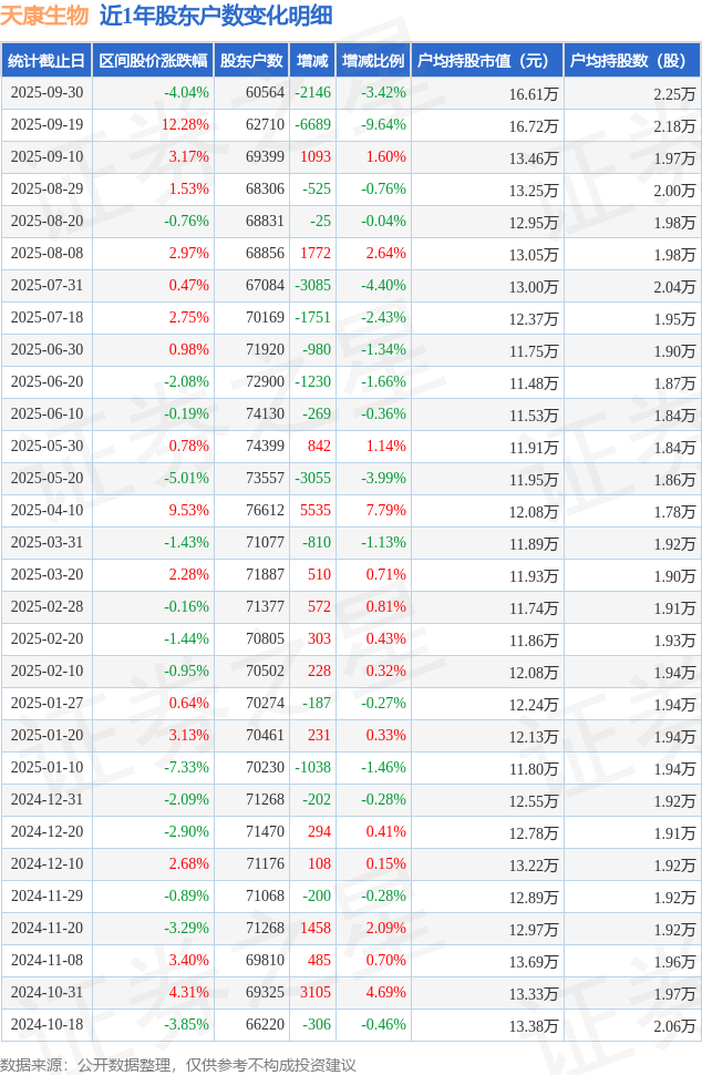 从股价来看,2025年9月19日至2025年9月30日,天康生物区间跌幅为4.04%,在此期间股东户数减少2146.0户,减幅为3.42%。
