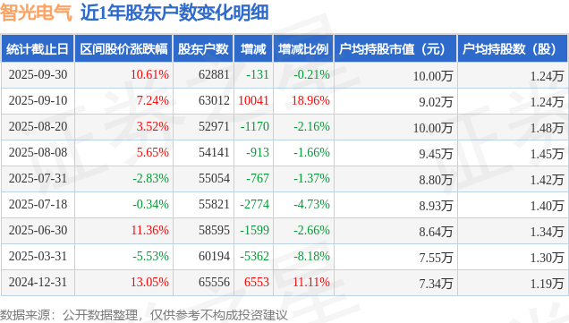 从股价来看,2025年9月10日至2025年9月30日,智光电气区间涨幅为10.61%,在此期间股东户数减少131.0户,减幅为0.21%。