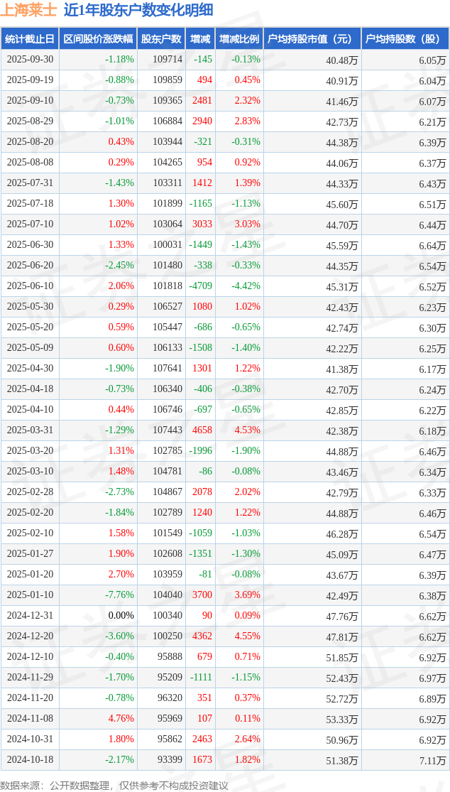 证券之星消息,近日上海莱士披露,截至2025年9月30日公司股东户数为10.97万户,较9月19日减少145.0户,减幅为0.13%。户均持股数量由上期的6.04万股增加至6.05万股,户均持股市值为40.48万元。