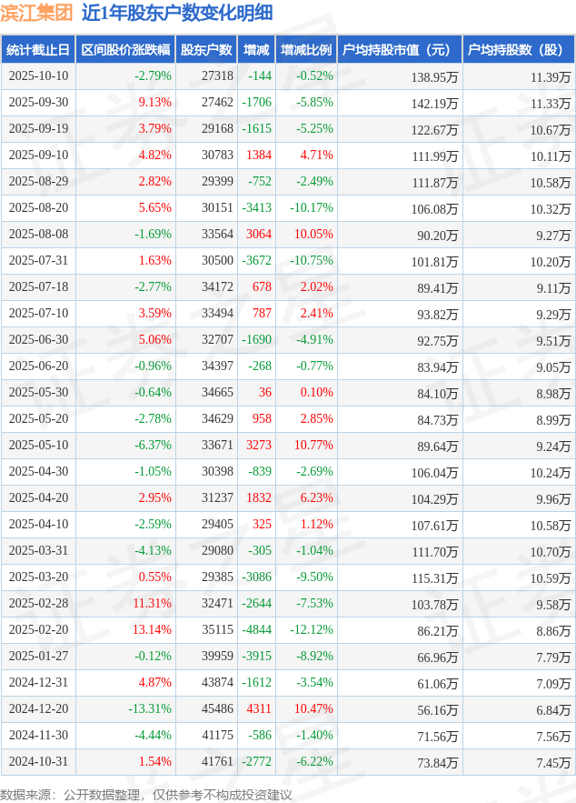 从股价来看,2025年9月30日至2025年10月10日,滨江集团区间跌幅为2.79%,在此期间股东户数减少144.0户,减幅为0.52%。