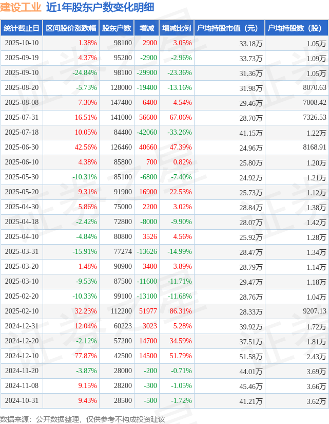 从股价来看,2025年9月19日至2025年10月10日,建设工业区间涨幅为1.38%,在此期间股东户数增加2900.0户,增幅为3.05%。