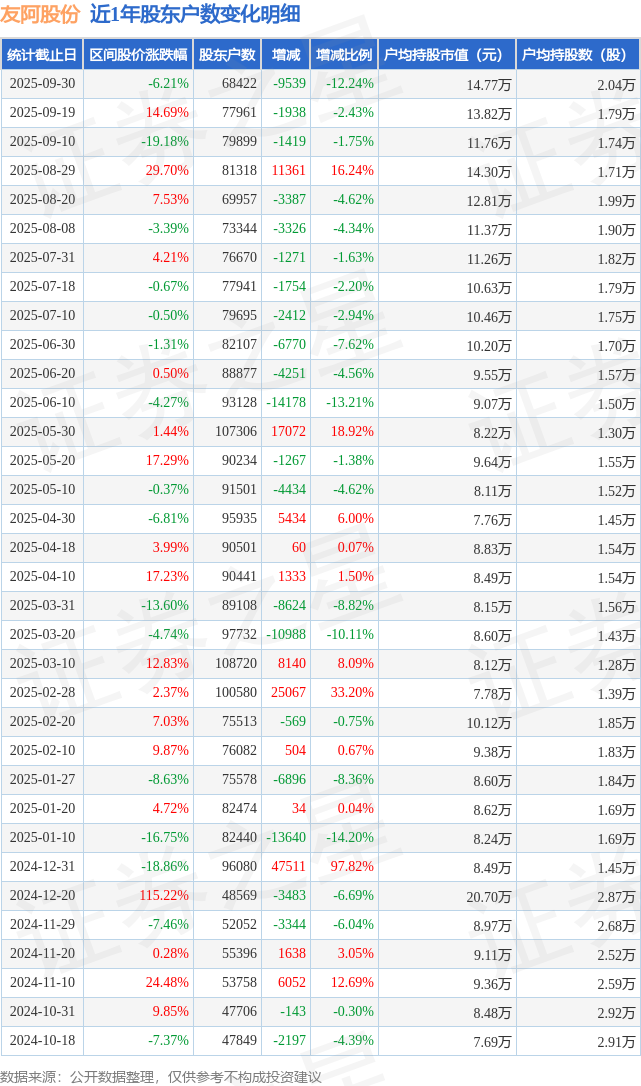 从股价来看,2025年9月19日至2025年9月30日,友阿股份区间跌幅为6.21%,在此期间股东户数减少9539.0户,减幅为12.24%。