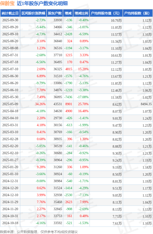 从股价来看,2025年9月20日至2025年9月30日,保龄宝区间跌幅为2.73%,在此期间股东户数减少136.0户,减幅为0.4%。