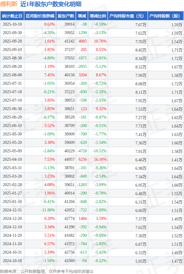 从股价来看,2025年9月30日至2025年10月10日,得利斯区间涨幅为0.63%,在此期间股东户数减少38.0户,减幅为0.1%。