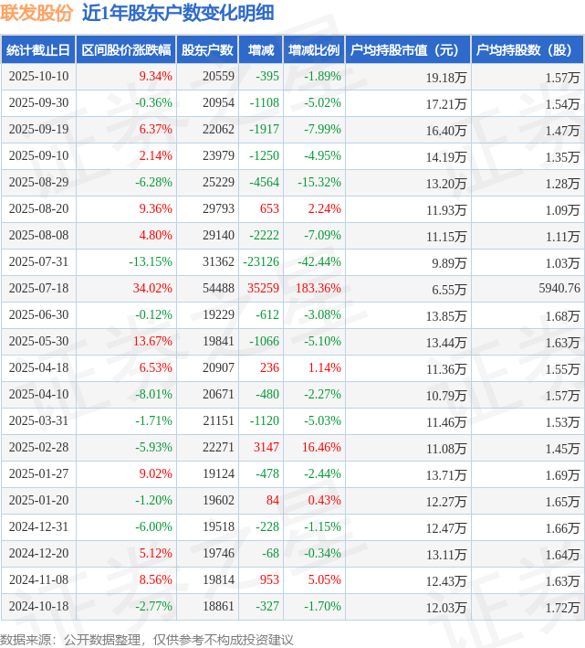 从股价来看,2025年9月30日至2025年10月10日,联发股份区间涨幅为9.34%,在此期间股东户数减少395.0户,减幅为1.89%。
