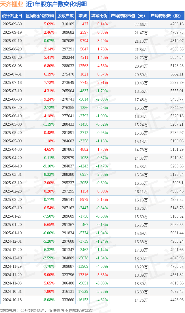 从股价来看,2025年9月19日至2025年9月30日,天齐锂业区间涨幅为5.69%,在此期间股东户数增加427.0户,增幅为0.14%。