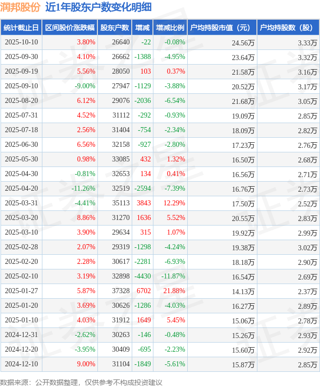 从股价来看,2025年9月30日至2025年10月10日,润邦股份区间涨幅为3.8%,在此期间股东户数减少22.0户,减幅为0.08%。