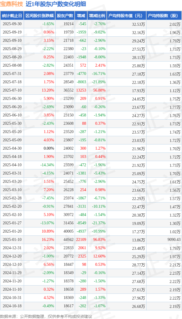 证券之星消息,近日宝鼎科技披露,截至2025年9月30日公司股东户数为1.92万户,较9月19日减少545.0户,减幅为2.76%。户均持股数量由上期的1.96万股增加至2.02万股,户均持股市值为32.53万元。