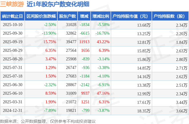 从股价来看,2025年9月30日至2025年10月10日,三峡旅游区间跌幅为2.5%,在此期间股东户数减少1834.0户,减幅为5.58%。