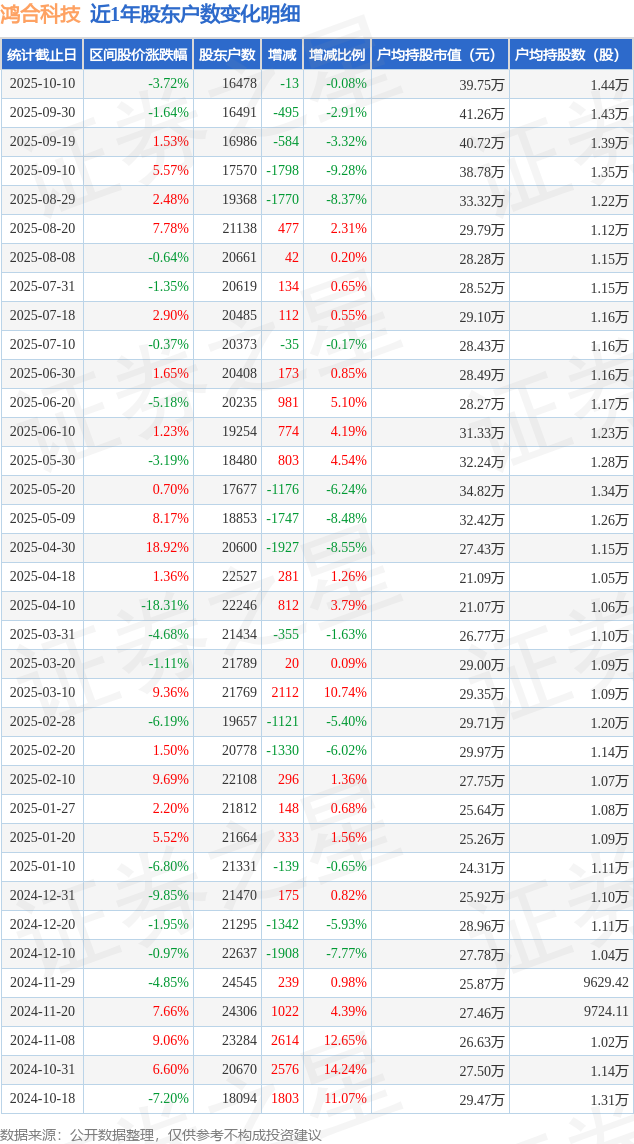 从股价来看,2025年9月30日至2025年10月10日,鸿合科技区间跌幅为3.72%,在此期间股东户数减少13.0户,减幅为0.08%。