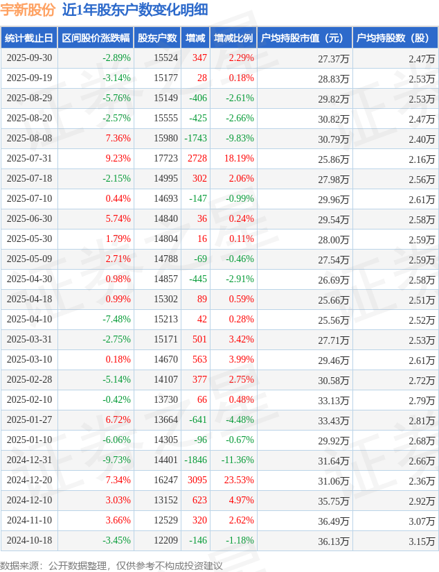 从股价来看,2025年9月19日至2025年9月30日,宇新股份区间跌幅为2.89%,在此期间股东户数增加347.0户,增幅为2.29%。