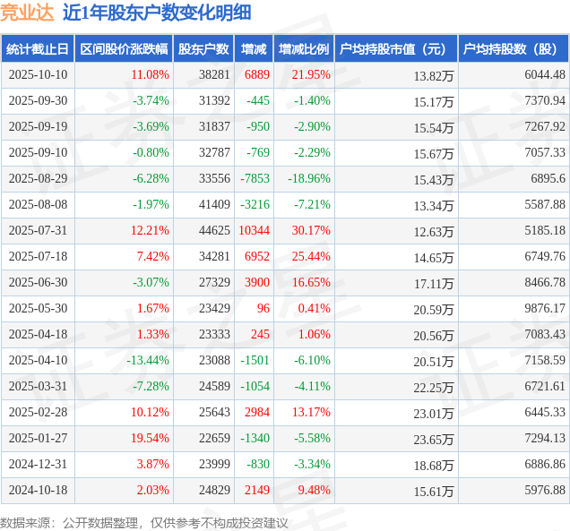 从股价来看,2025年9月30日至2025年10月10日,竞业达区间涨幅为11.08%,在此期间股东户数增加6889.0户,增幅为21.95%。