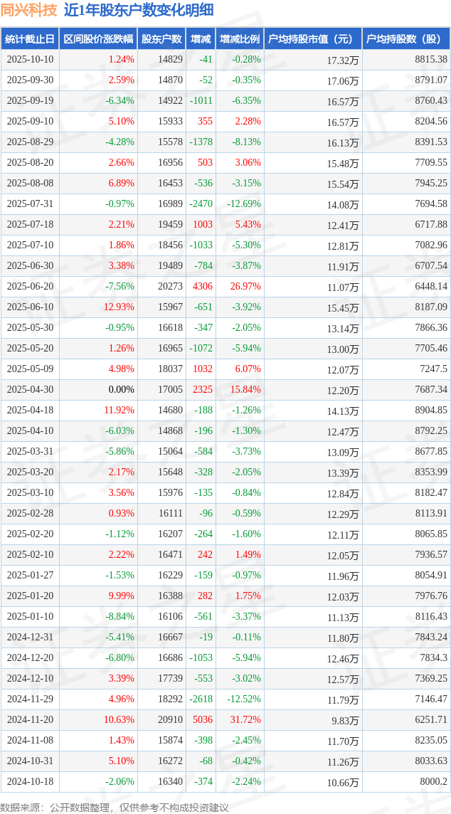 从股价来看,2025年9月30日至2025年10月10日,同兴科技区间涨幅为1.24%,在此期间股东户数减少41.0户,减幅为0.28%。