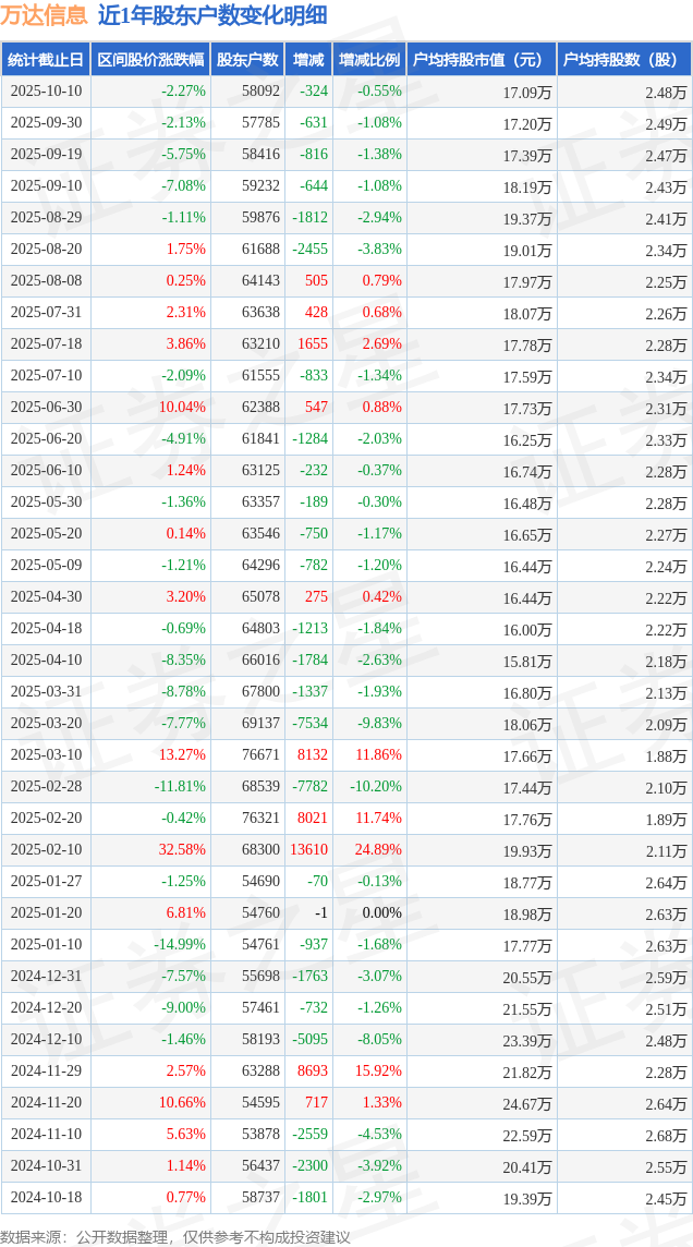 从股价来看,2025年9月19日至2025年10月10日,万达信息区间跌幅为2.27%,在此期间股东户数减少324.0户,减幅为0.55%。