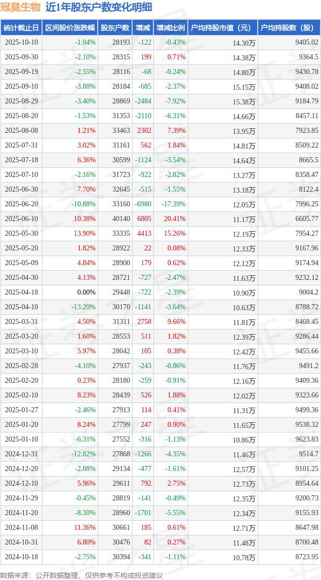 从股价来看,2025年9月30日至2025年10月10日,冠昊生物区间跌幅为1.04%,在此期间股东户数减少122.0户,减幅为0.43%。