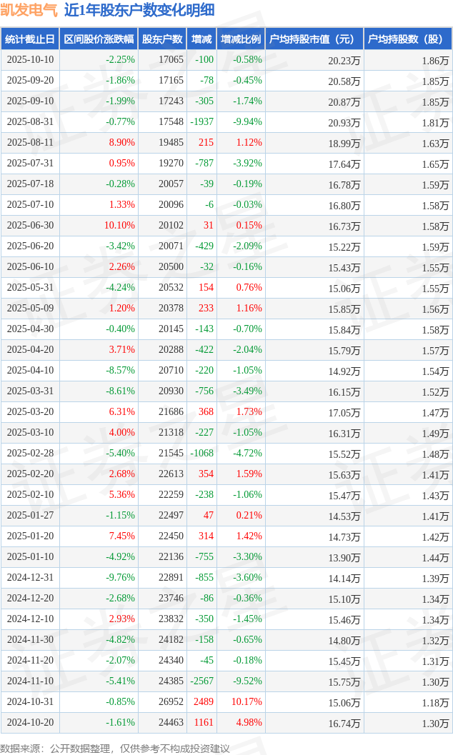 从股价来看,2025年9月20日至2025年10月10日,凯发电气区间跌幅为2.25%,在此期间股东户数减少100.0户,减幅为0.58%。