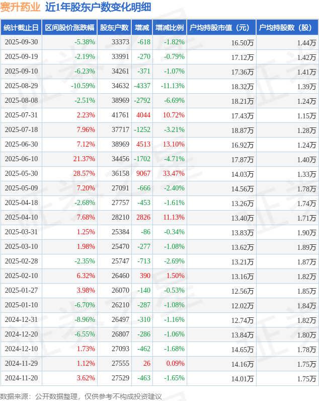 从股价来看,2025年9月19日至2025年9月30日,赛升药业区间跌幅为5.38%,在此期间股东户数减少618.0户,减幅为1.82%。
