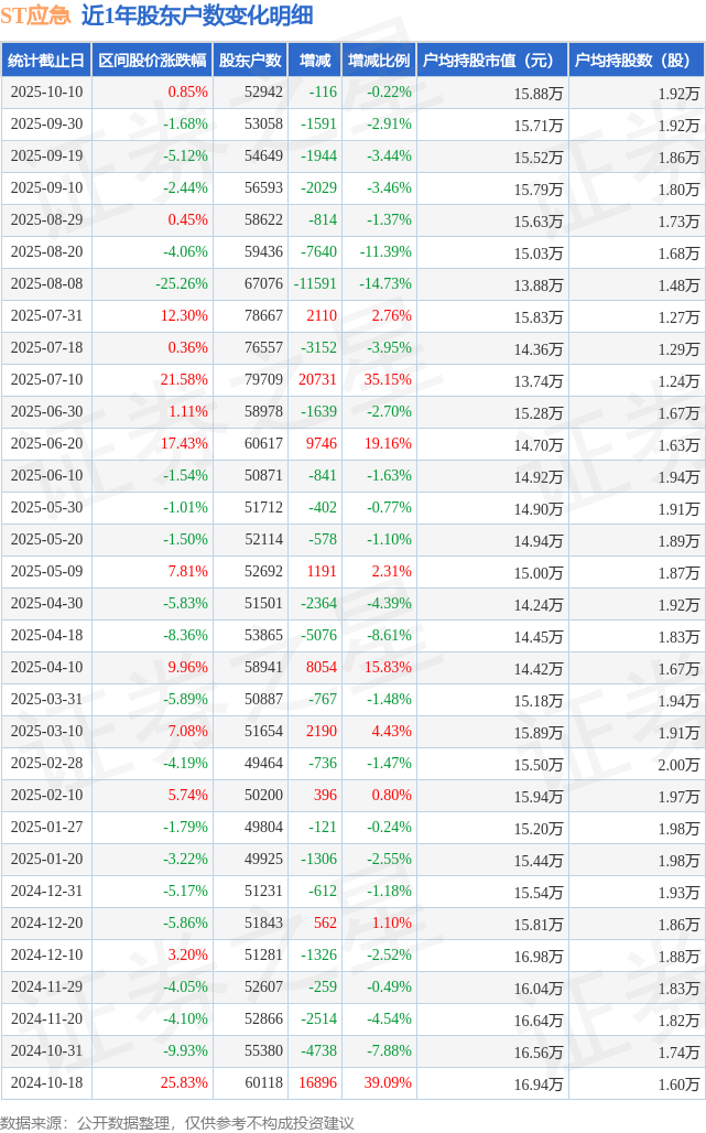 从股价来看,2025年9月30日至2025年10月10日,ST应急区间涨幅为0.85%,在此期间股东户数减少116.0户,减幅为0.22%。