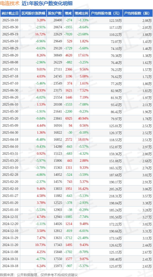 从股价来看,2025年9月30日至2025年10月10日,电连技术区间涨幅为3.28%,在此期间股东户数减少274.0户,减幅为1.33%。