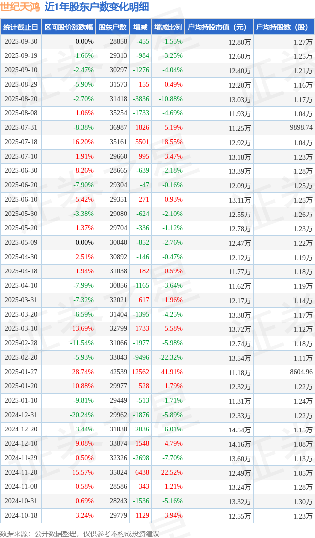 从股价来看,2025年9月19日至2025年9月30日,世纪天鸿区间跌幅为0.0%,在此期间股东户数减少455.0户,减幅为1.55%。