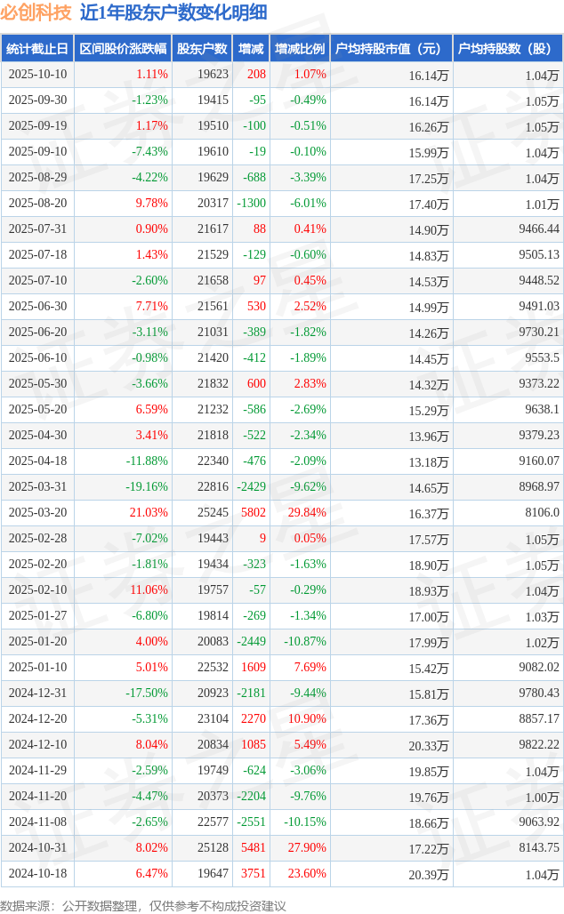 从股价来看,2025年9月30日至2025年10月10日,必创科技区间涨幅为1.11%,在此期间股东户数增加208.0户,增幅为1.07%。