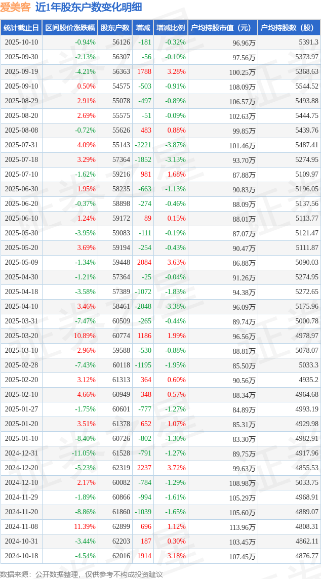 从股价来看,2025年9月30日至2025年10月10日,爱美客区间跌幅为0.94%,在此期间股东户数减少181.0户,减幅为0.32%。