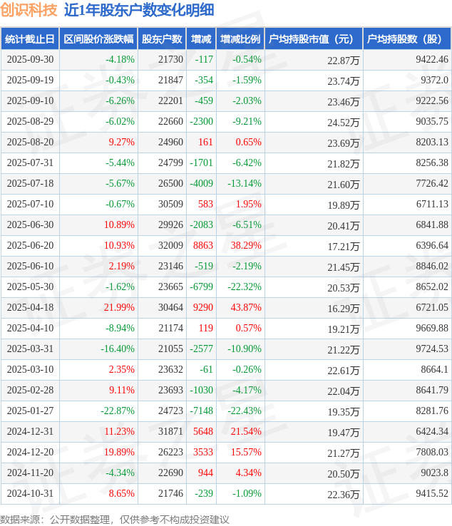 从股价来看,2025年9月19日至2025年9月30日,创识科技区间跌幅为4.18%,在此期间股东户数减少117.0户,减幅为0.54%。