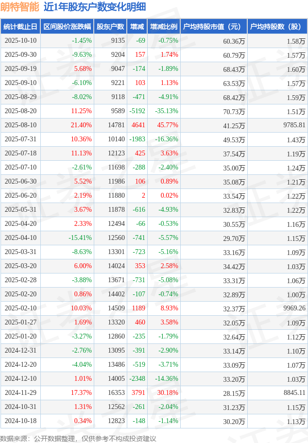 从股价来看,2025年9月30日至2025年10月10日,朗特智能区间跌幅为1.45%,在此期间股东户数减少69.0户,减幅为0.75%。