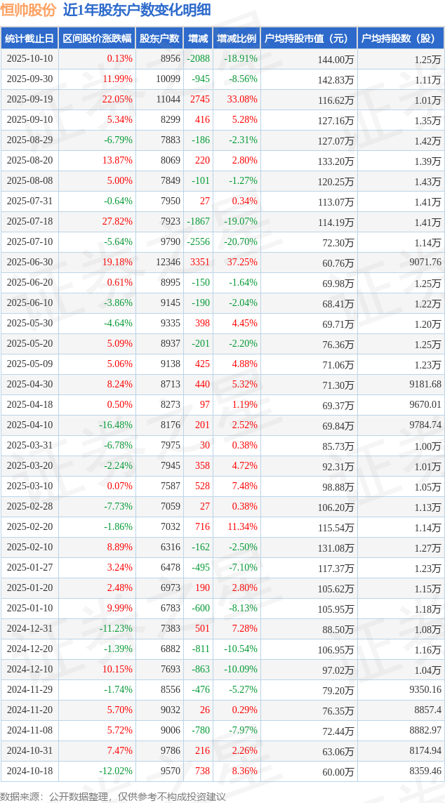 从股价来看,2025年9月19日至2025年10月10日,恒帅股份区间涨幅为0.13%,在此期间股东户数减少2088.0户,减幅为18.91%。