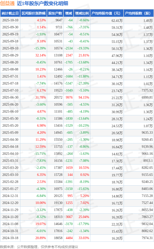 从股价来看,2025年9月30日至2025年10月10日,创益通区间涨幅为4.53%,在此期间股东户数减少64.0户,减幅为0.66%。