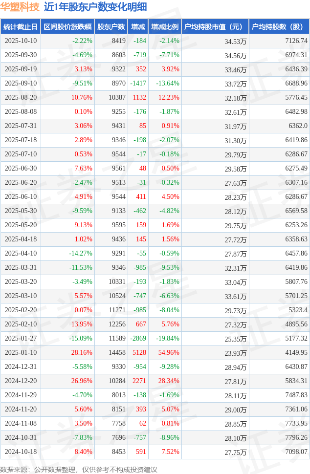 从股价来看,2025年9月30日至2025年10月10日,华塑科技区间跌幅为2.22%,在此期间股东户数减少184.0户,减幅为2.14%。