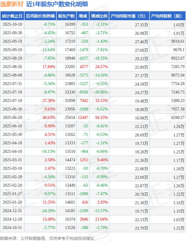 从股价来看,2025年9月30日至2025年10月10日,逸豪新材区间跌幅为0.75%,在此期间股东户数减少353.0户,减幅为2.11%。