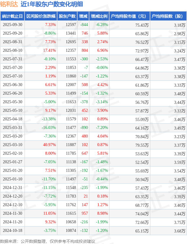 从股价来看,2025年9月20日至2025年9月30日,铭利达区间涨幅为7.33%,在此期间股东户数减少844.0户,减幅为6.28%。
