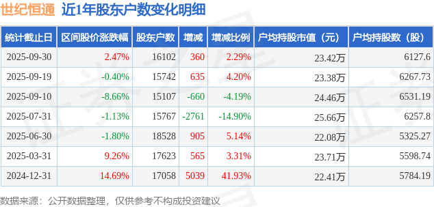 从股价来看,2025年9月19日至2025年9月30日,世纪恒通区间涨幅为2.47%,在此期间股东户数增加360.0户,增幅为2.29%。