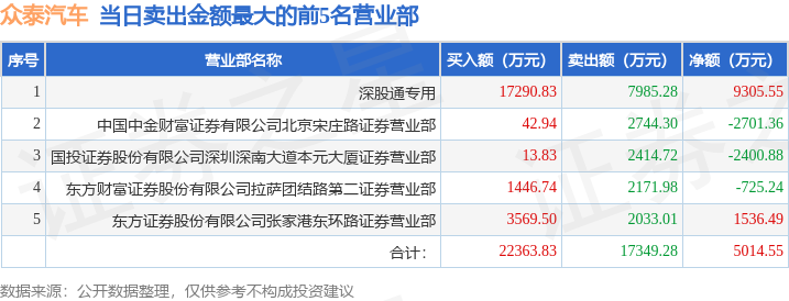 证券之星消息,沪深交易所2025年10月13日公布的交易公开信息显示,众泰汽车(000980)因日涨幅偏离值达到7%的前5只证券登上龙虎榜。此次是近5个交易日内第1次上榜。