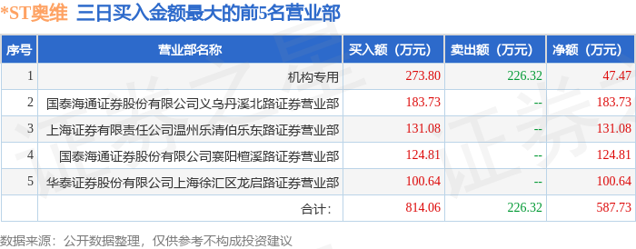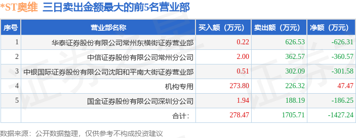 证券之星消息,沪深交易所2025年10月13日公布的交易公开信息显示,*ST奥维(002231)因连续三个交易日内,跌幅偏离值累计达到12%的ST证券、*ST证券和未完成股改证券登上龙虎榜。此次是近5个交易日内第1次上榜。