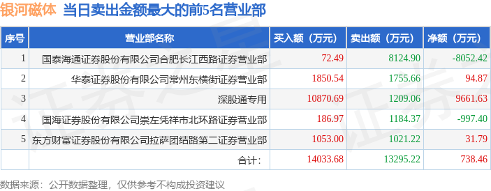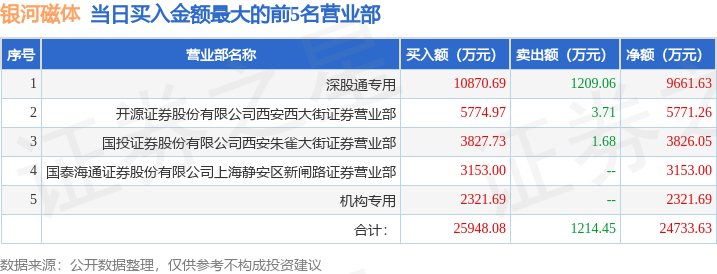 证券之星消息,沪深交易所2025年10月13日公布的交易公开信息显示,银河磁体(300127)因日涨幅达到15%的前5只证券登上龙虎榜。此次是近5个交易日内第1次上榜。