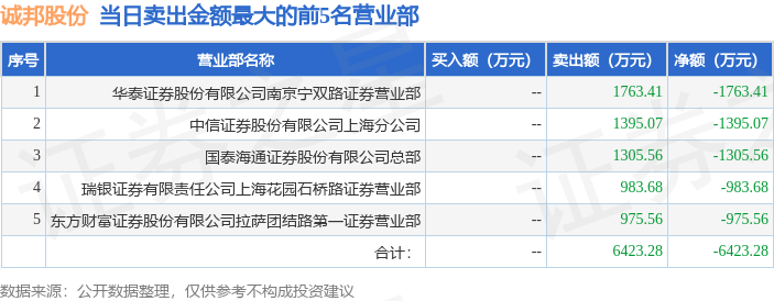 证券之星消息,沪深交易所2025年10月13日公布的交易公开信息显示,诚邦股份(603316)因有价格涨跌幅限制的日收盘价格跌幅偏离值达到7%的前五只证券登上龙虎榜。此次是近5个交易日内第1次上榜。